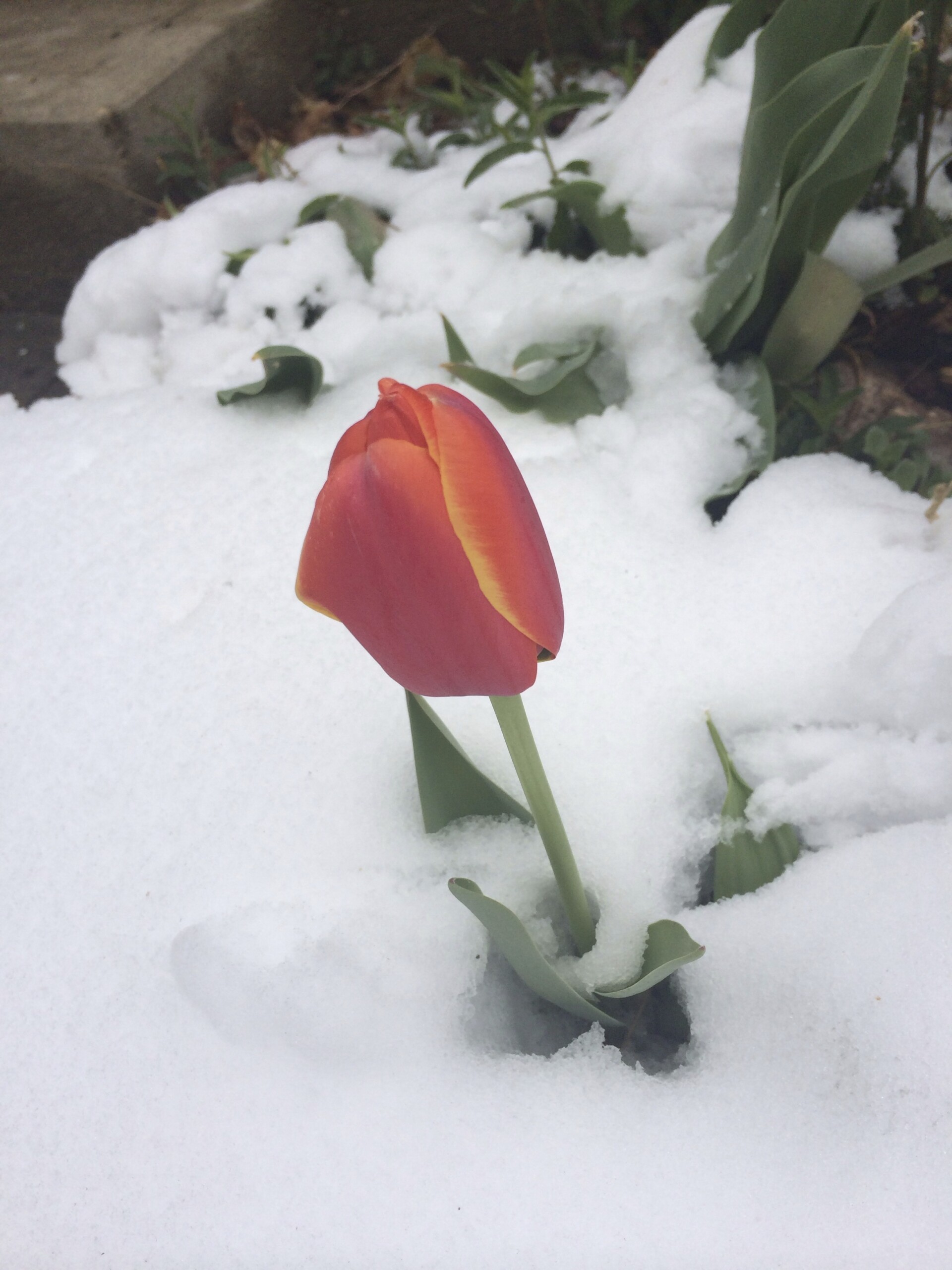 - Snow and red tulips.