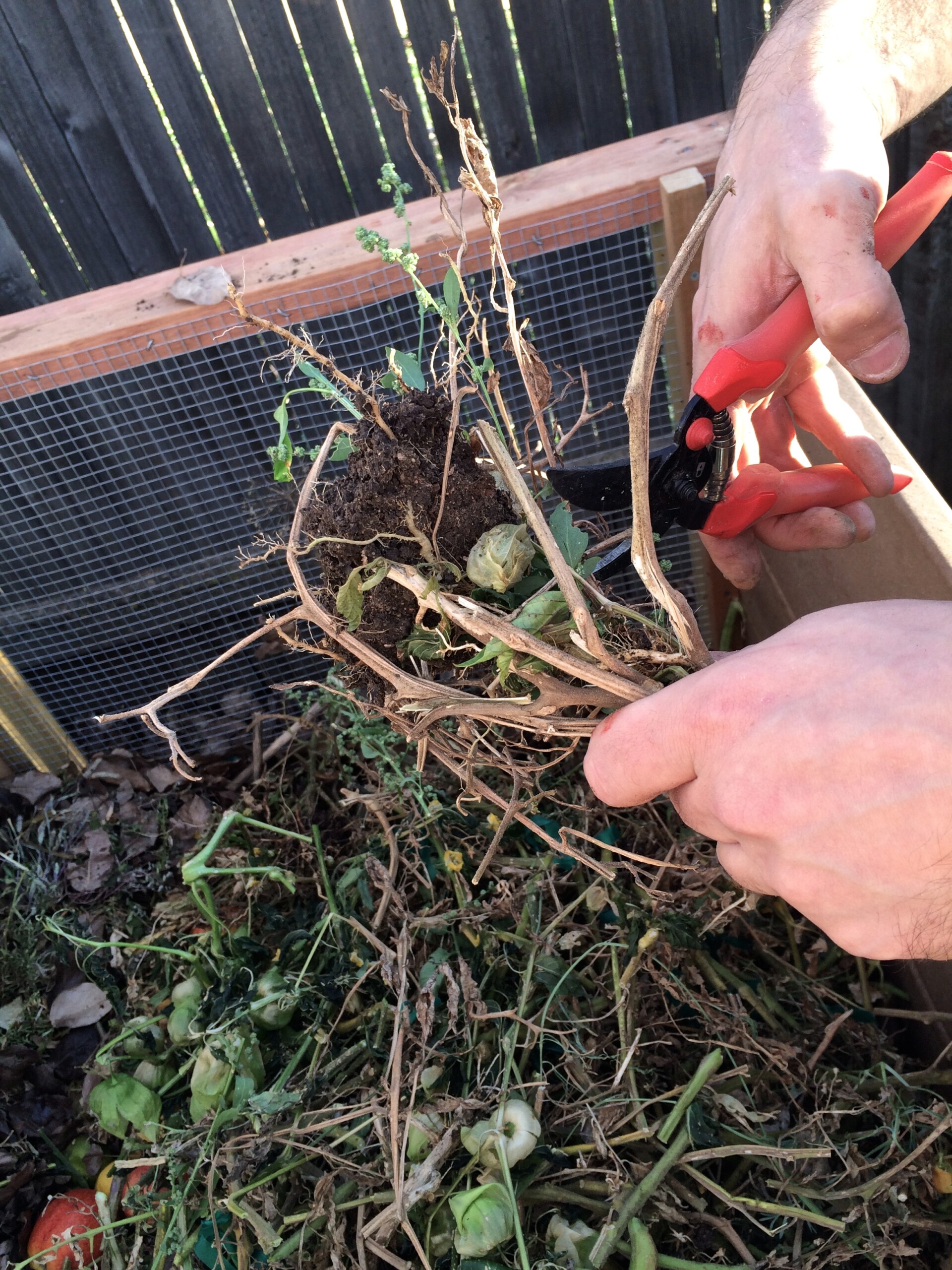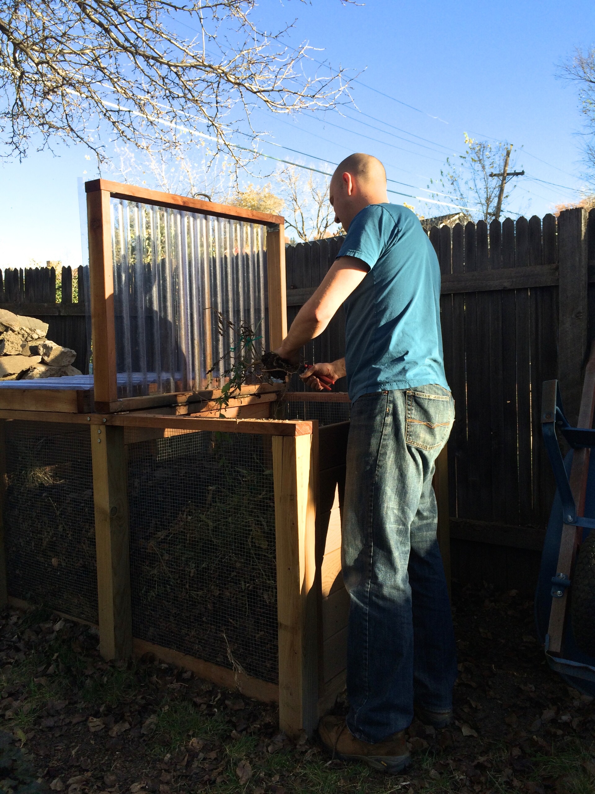 - Steve breaking down the dead tomato vines and composting them. We built this 2-bin compost system earlier this spring and are already seeing some “black gold.”