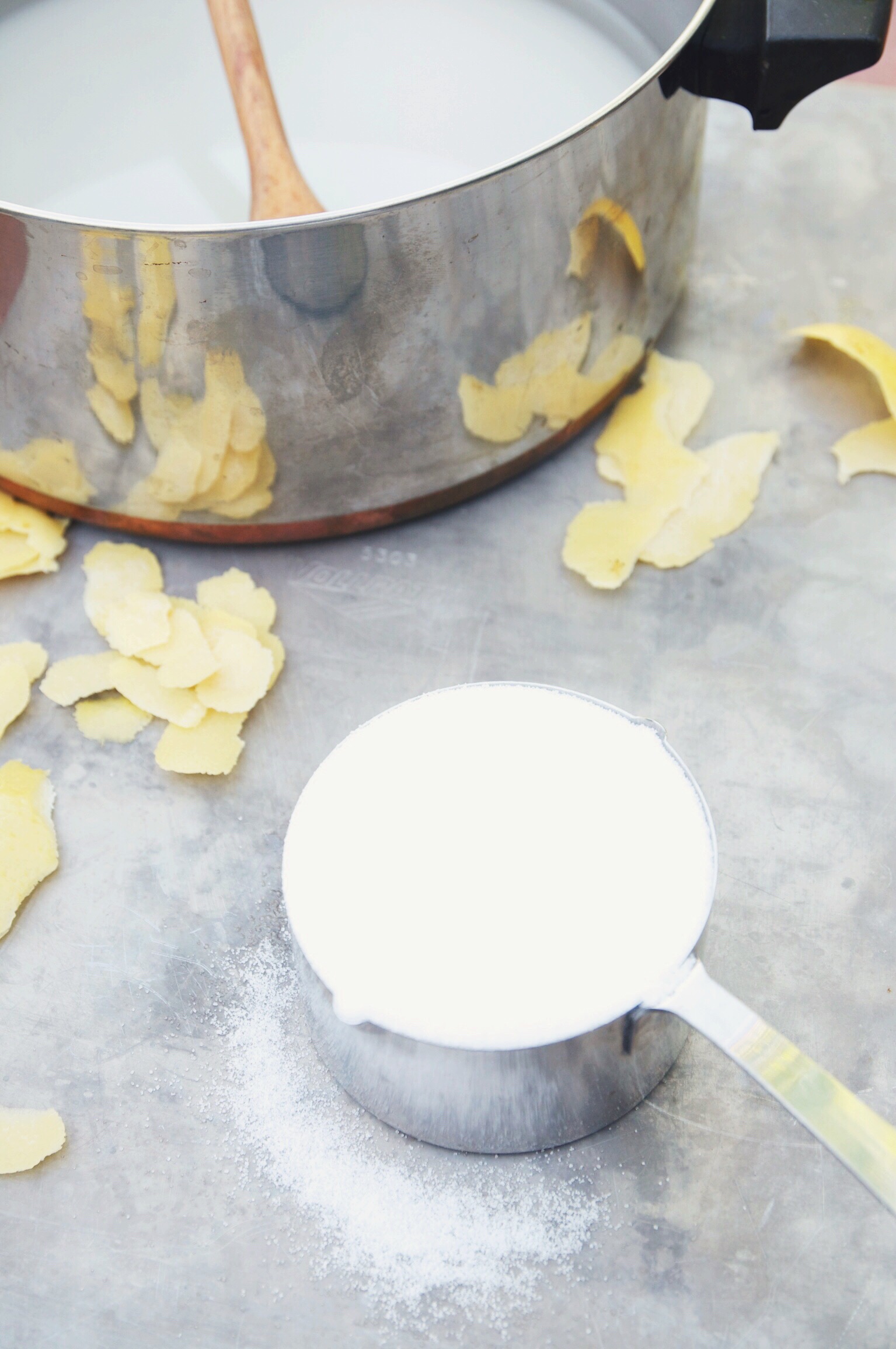 - Scrub and peel the lemons, using a vegetable peeler. Try your best to avoid including any of the white pith, which adds undesirable bitterness.